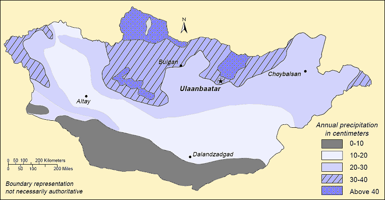 Mongolia is high, cold, and dry. It has an extreme continental climate with long, cold winters and short summers, during which most precipitation falls. The country averages 257 cloudless days a year, and it is usually at the center of a region of high atmospheric pressure. Precipitation is highest in the north, which averages 20 to 35 centimeters per year, and lowest in the south, which receives 10 to 20 centimeters. The extreme south is the Gobi, some regions of which receive no precipitation at all in most years. The name Gobi is a Mongol meaning desert, depression, salt marsh, or steppe, but which usually refers to a category of arid rangeland with insufficient vegetation to support marmots but with enough to support camels. Mongols distinguish gobi from desert proper, although the distinction is not always apparent to outsiders unfamiliar with the Mongolian landscape. Gobi rangelands are fragile and are easily destroyed by overgrazing, which results in expansion of the true desert, a stony waste where not even Bactrian camels can survive.