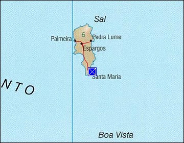 Serra Negra (the "black mountains") shows its volcanic origin by its color. The sea at the eastern side of Sal is generally rather rough and not suitable for bathing.![]() |