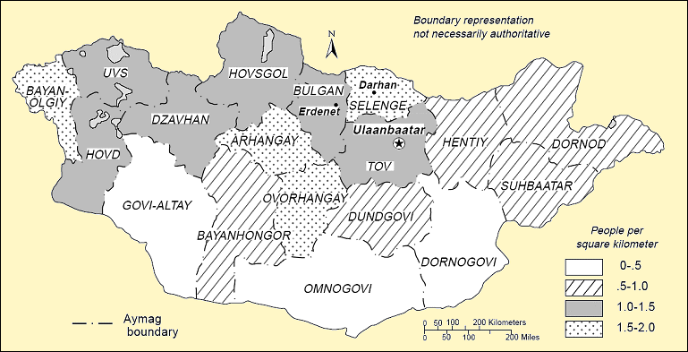 Mongolia's population is sparsely distributed, young, and increasing rapidly. With an estimated midyear 1989 population of 2,125,463, the average population density was 1.36 people per square kilometer.