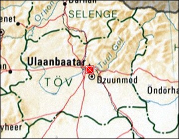 Ulaanbaatar with its 800,000 inhabitants produces considerable smog. The haze over Ulaanbaatar can be clearly seen despite the clear day.![]() |
