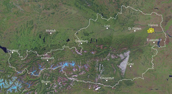 Here you see Austria from space. The area of Vienna is highlighted in yellow color. Image courtesy of Earth Sciences and Image Analysis Laboratory, NASA Johnson Space Center.